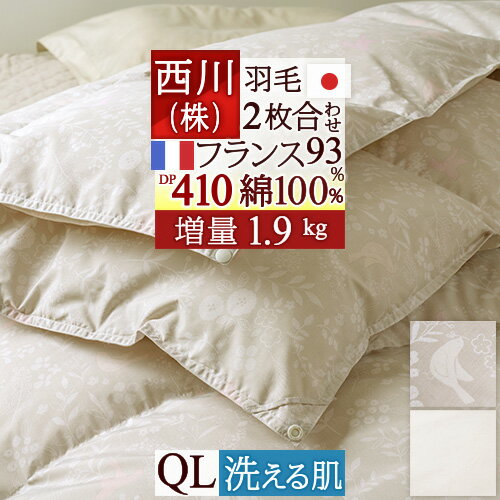 超目玉★15%OFFクーポン 羽毛布団 西川 クイーンサイズ【西川掛布団カバー等特典付】クィーン 2枚合わせ 『増量1.9kg』 フランス産ダウン93% DP410 羽毛ふとん 綿100% 日本製 洗える 2枚合せ 羽毛掛け布団 オールシーズン クイーン 二枚合わせ