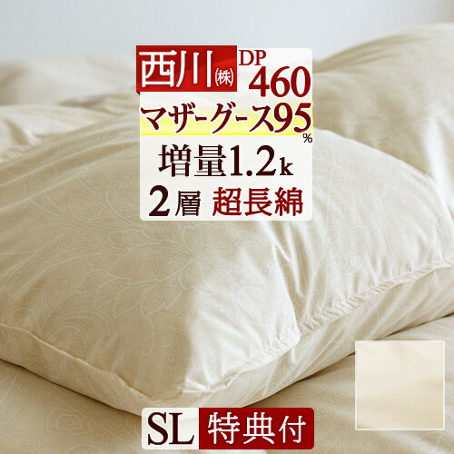 12/1限定★11%OFFクーポン 羽毛布団 2枚合わせ シングル 西川 マザーグース ハンガリー産 マザーグース95% 羽毛ふとん DP460 グース 『増量1.2kg』 綿100% 超長綿 1年中使える 春夏秋冬用 オールシーズン対応 日本製 シングルロング ◇