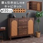 【完成品設置付き】 ラタン調 3段 キャビネット 幅120cm チェスト マルチラック 扉付き 2枚 本棚 整理棚 引き出し 3杯 衣類 取っ手付き ディスプレイラック