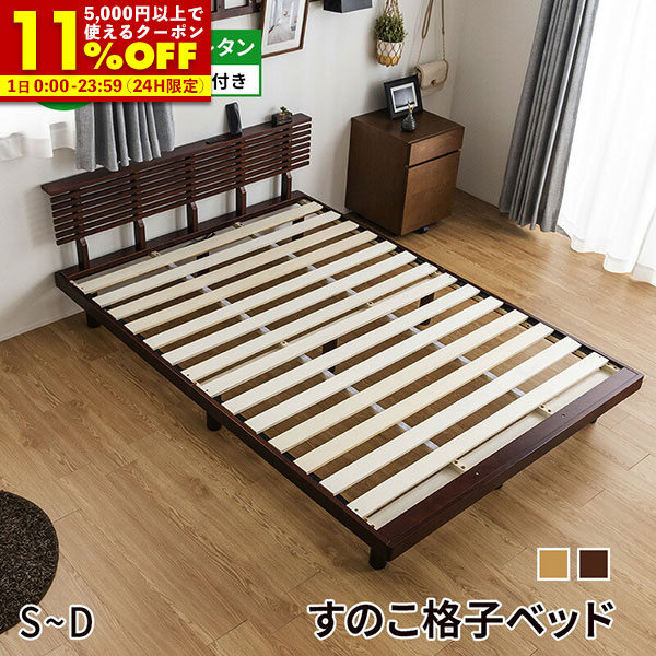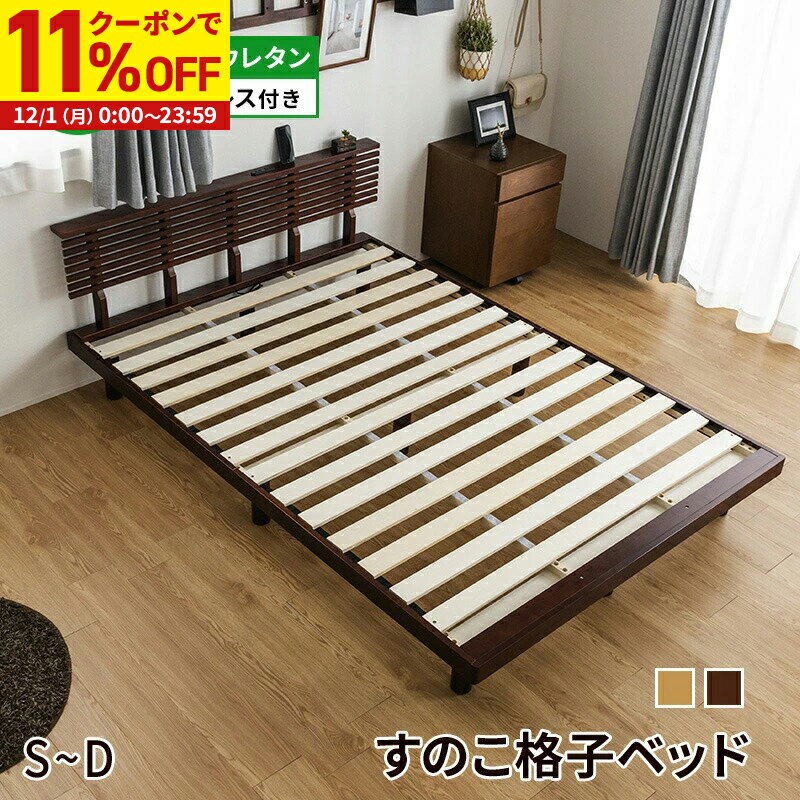 【11%OFFクーポン配布中★12/1に使える】 ベッド すのこベッド シングル セミダブル ダブル マットレス付き ウレタンマットレス おしゃれ 天然パイン材 2口コンセント付き 宮付き ローベッド 頑丈 シンプル 天然木フレーム 敷布団 木製ベッド