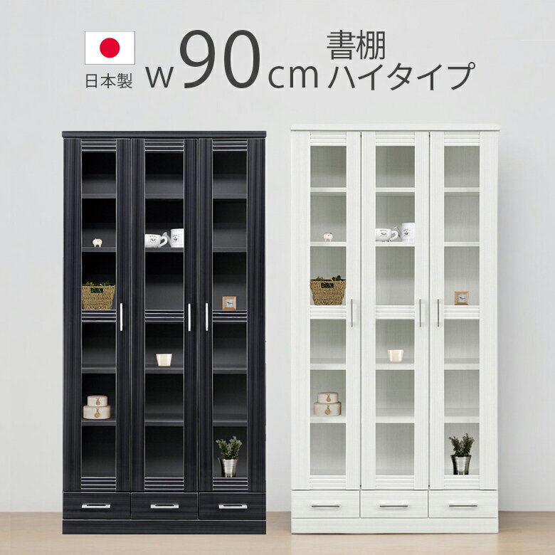【全商品に使える11%offクーポンあり!!】 書棚 ブックシェルフ 幅90cm 引出付き ハイタイプ 木製 扉収納 ガラス扉 おしゃれ 開き扉 日本製 国産 本棚 扉付き 大容量 90幅 収納 黒 ブラック 白 ホワイト ハイグロス シンプル 木製収納