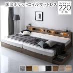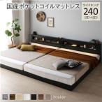 (タイムセール中) ワイドキングサイズベッド 2台セット WK240(SD+SD) マットレス付き 国産ポケットコイルマットレス 連結ベッド ローベッド 照明 棚付 宮付