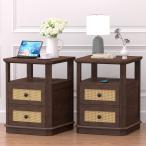 【並行輸入品】REDAYFUR エンドテーブル2個セット 充電ステーション付き 高さ24インチ ソファサイドテーブル 籐製引き出し付き 衝突防止