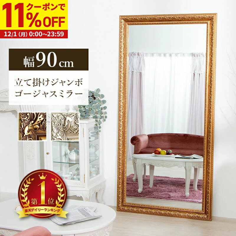 【11%OFFクーポン配布中★12/1に使える】 鏡 ミラー 全身 姿見 アンティーク調大型ミラーW90 ゴールド シルバー 幅90 ビッグミラー 全身鏡 立掛け ダンス用ミラー 姿見 ジャンボミラー 金 銀 ガラス製ミラー