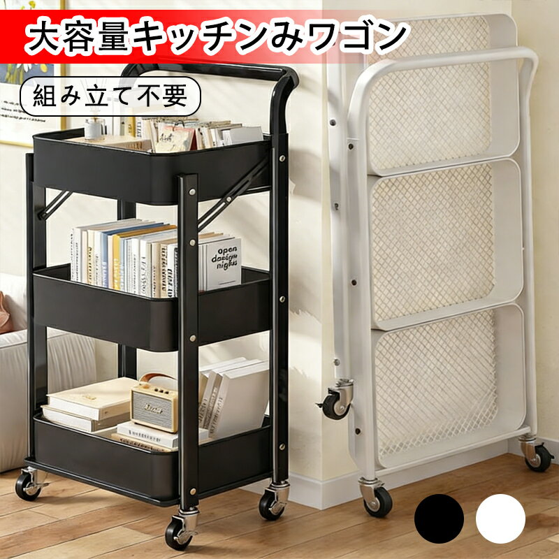 【★0の日★全品10%OFF+P5】【組立不要・折りたたみ式】キッチンワゴン 3段 収納ラック オール金属構造 キャスター付き 防錆 キッチン収納 隙間収納 リビング 浴室 ベッドルーム 調味料棚 スチールラック 収納カート