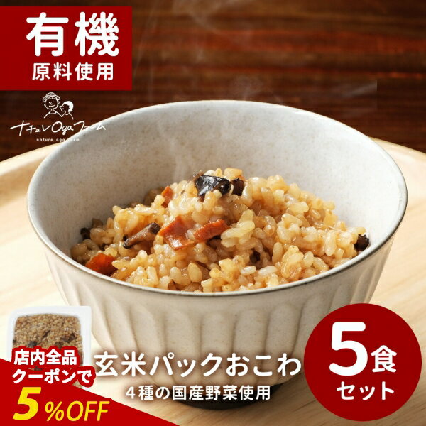 【全品クーポンで5%OFF】玄米 パック 玄米パック 五目 おこわ 160g×5個 国産 野菜 有機 JAS認証 うるち玄米 もち米 ごぼう 人参 切り干し大根 具だくさん レンジ 簡単 弁当 保存食 非常食 健康 ご飯 ごはん(レトルト) お米 0918
