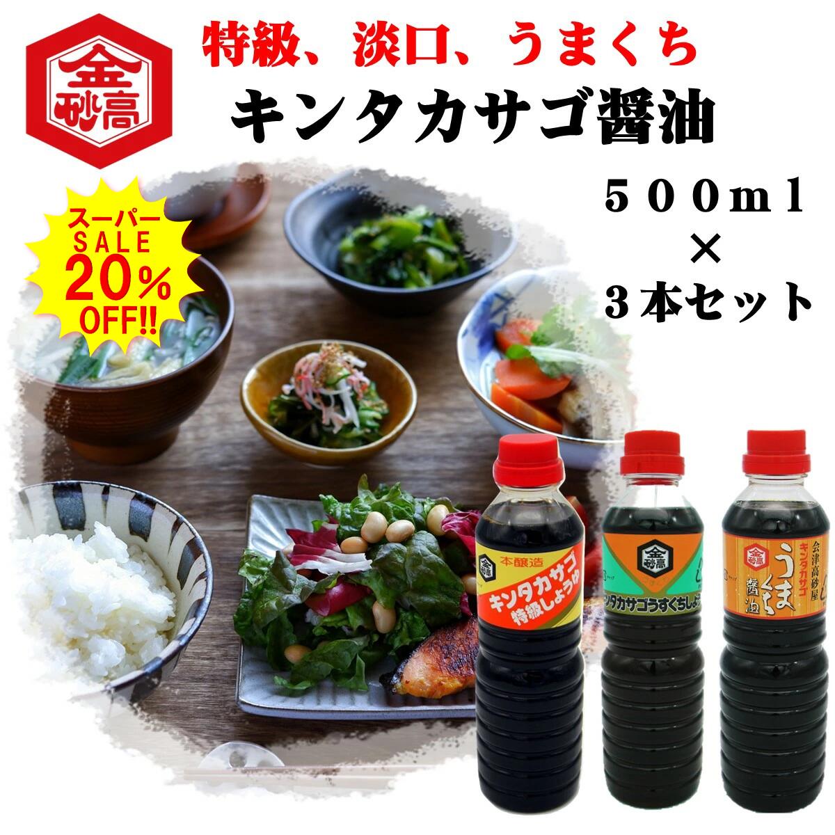 【楽天スーパーSALE20%OFF】【贈答用・ギフト箱】キンタカサゴ醤油500ml3本セット キンタカサゴ特級しょうゆ キンタカサゴ淡口しょうゆ キンタカサゴうまくち醤油 おいしい醤油 会津 醤油 手土産 全国醤油品評会 ミニサイズ