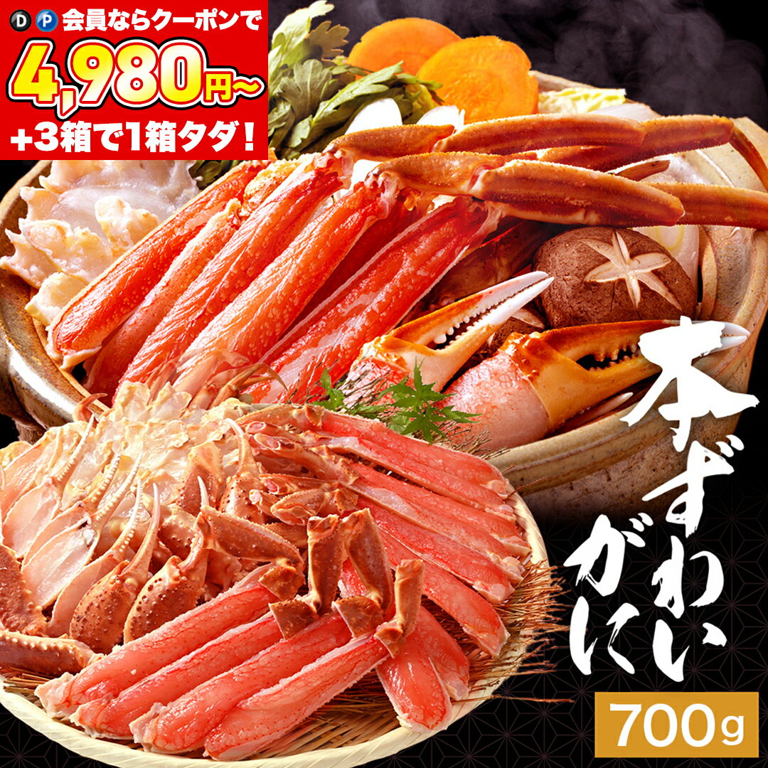 値上げ前に★今の価格12/11まで!3箱で1箱タダ★5,700円OFFクーポンで総重量3kg送料無料11,400円!楽天年間ランキング5年連続1位!カット生ずわい蟹700g/総重量1kg かに 蟹 カニ