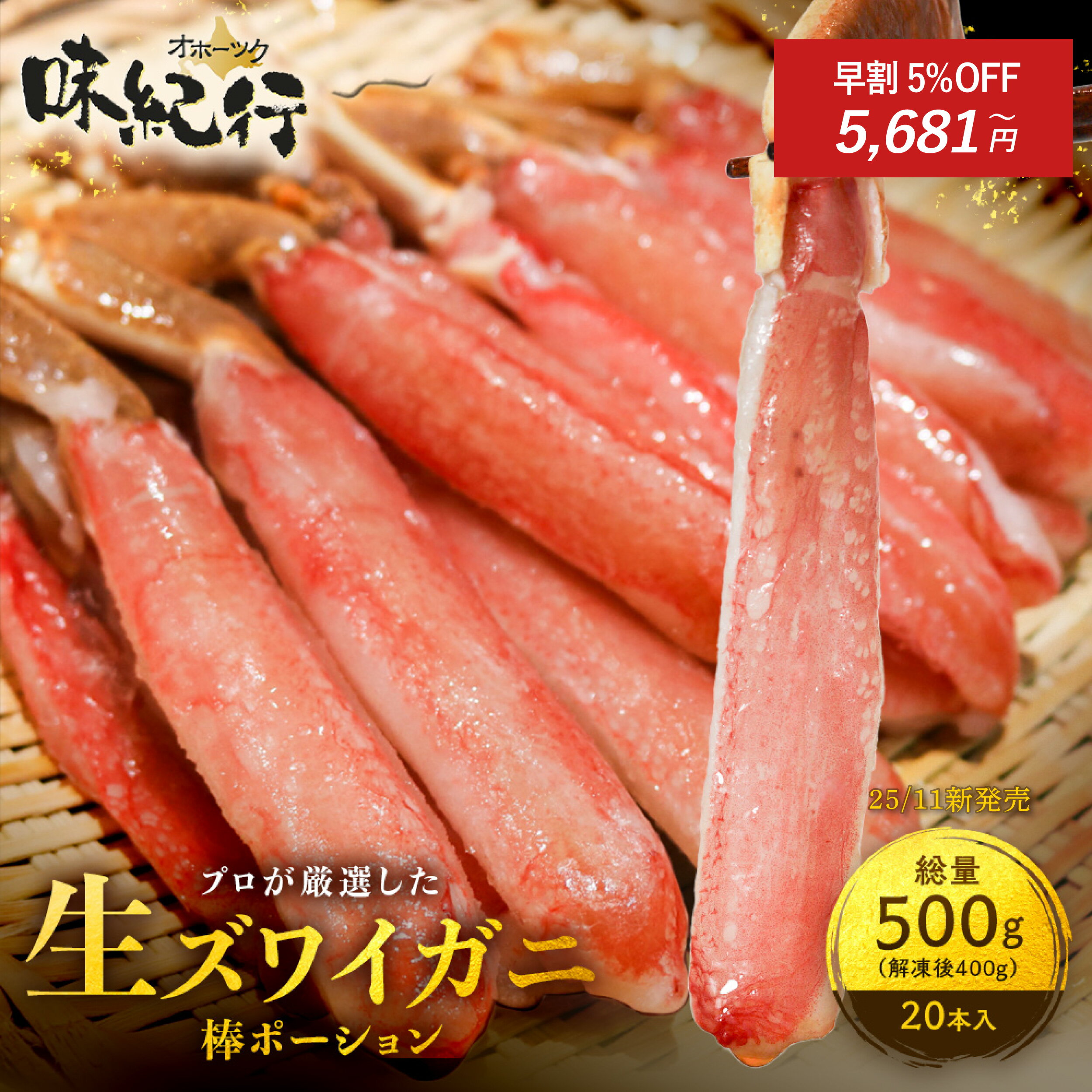 早割5%OFF!12/10迄の期間限定! 生ズワイガニ 棒ポーション 4L 贅沢サイズ 20本入 500g(解凍後400g) 殻むき不要 身入り抜群 棒肉 高鮮度 生食可能 冷凍 バラ凍結 ずわい蟹 新発売 オホーツク味紀行 お歳暮