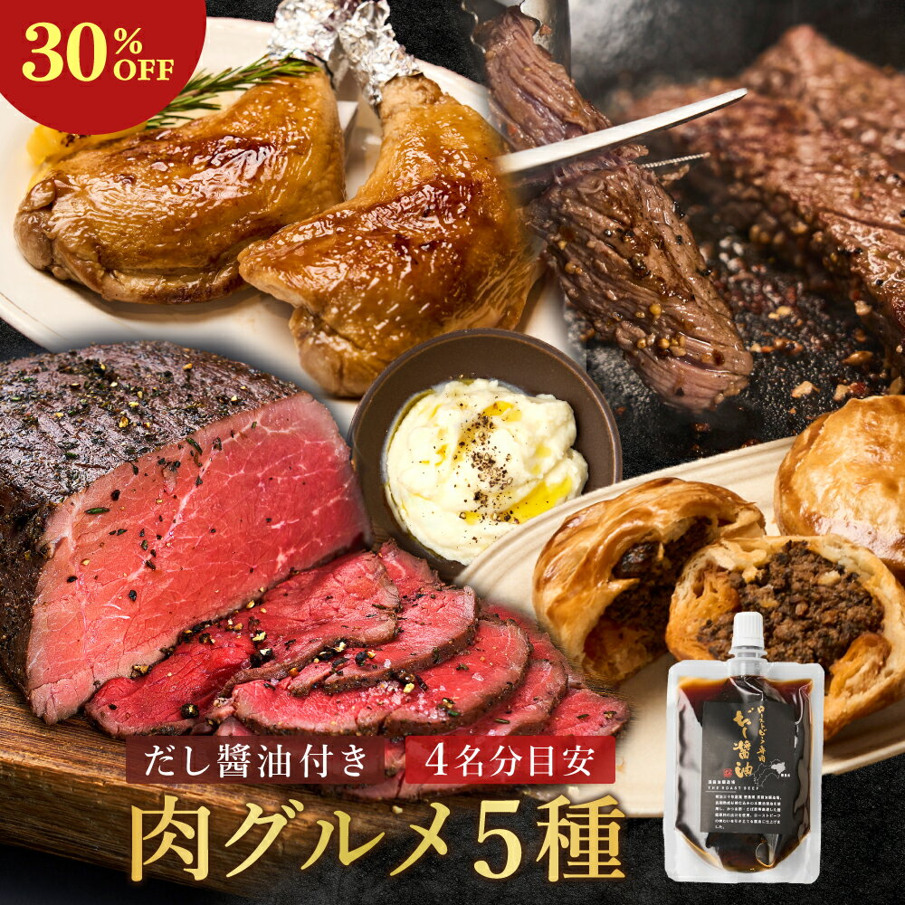 \先着20名《30%OFF》/《THE ROAST BEEF だし醤油100ml付き 肉福袋》【約2.4kg|4人前】三宿ローストビーフ400g(200g×2)・ローストチキンレッグ4本(280g×4)・黒トリュフ濃厚ミートパイ4個(100g×4)・赤城牛焼肉用赤身肉(300g)・マッシュポテト200g【だし醤油1本