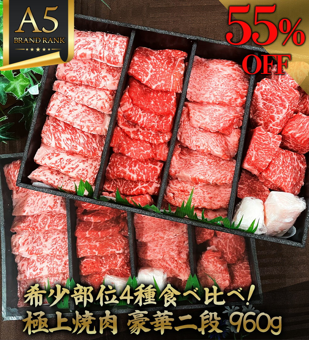 \スーパーSALE 55%OFF/ 豪華 折箱2段! A5ランク 和牛 焼肉セット ギフト【 佐賀牛 宮崎牛 希少部位 焼き肉 4種食べ比べ セット 960g 】焼肉 1kg お礼 ギフト 食品 お歳暮 人気 おすすめ 楽天 2025 内祝い 出産 結婚 入学 お返し 御歳暮 人気 のし 無料 喪中