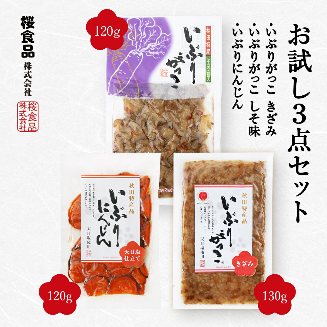 【 送料無料 】贈答 ギフト 年末年始 おためし 3点セットA いぶりがっこ スライス しそ味 きざみ 秋田 イブリガッコ 燻り 燻製 おつまみ たくわん 漬物 お試し 美味しい漬物 大根漬け物 スライス みじん切り たくあん 昔ながら 特産品 秋田県 郷土料理 ごはんのおともセット