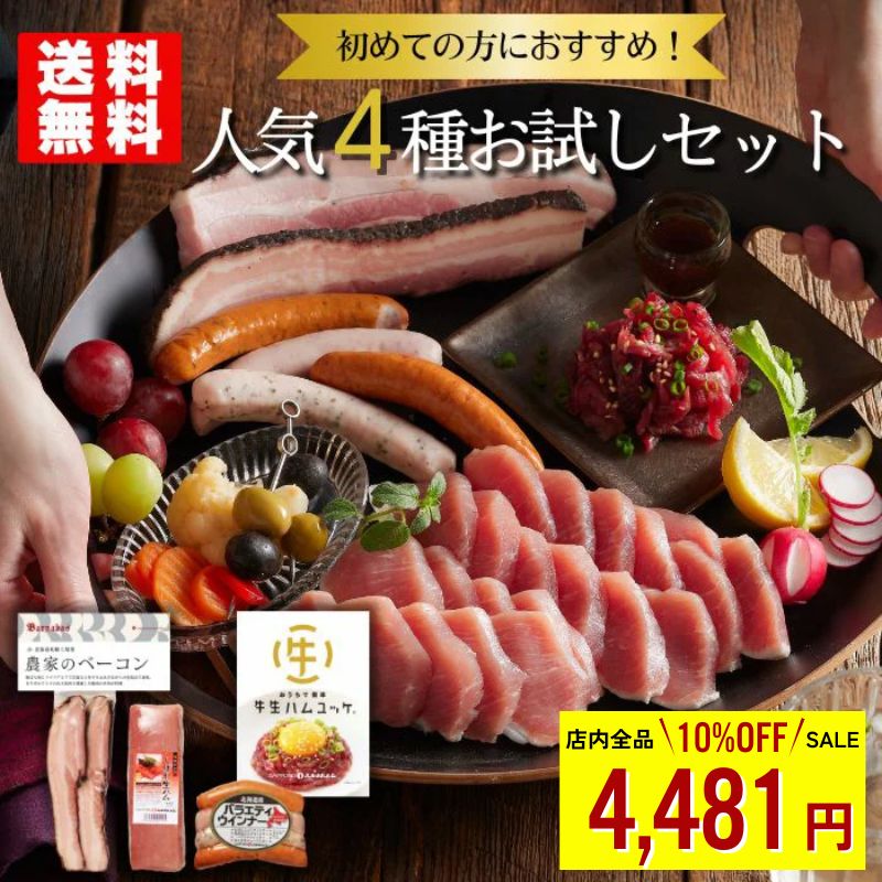 \スーパーSALE!スタートダッシュ20%OFFクーポン配布!4日20:00〜23:59/ 【送料無料】【お試し】札幌バルナバハム 人気商品 お試しセット 肉セット ユッケ ベーコン ウインナー 生ハム しばれ生ハム お肉 豚肉 肉 食品 詰め合わせ おつまみ プレゼント 北海道 刺身