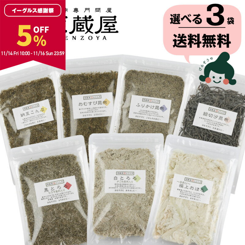 【5%OFF★11月14日10:00〜16日23:59まで限定】[選べる3袋]とろろ昆布 7種類 黒とろろ 白とろろ おぼろ昆布 おむすび昆布 昆布ふりかけ 納豆昆布 細切り塩昆布【食卓応援セール】