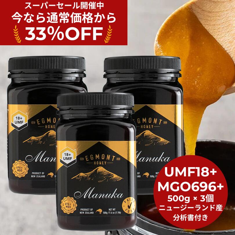★33%OFF!スーパーSALE限定割引★【送料無料】マヌカハニー UMF18+(MGO696+相当) 500g(3個セット)★エグモントハニー社★ニュージーランド産の無添加 無農薬 蜂蜜 100%天然(はちみつ・ハチミツ)