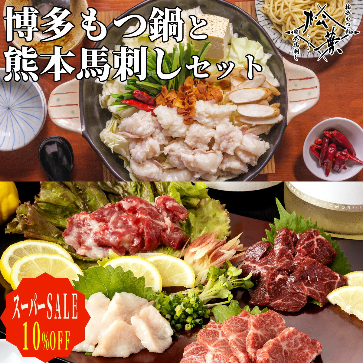 【スーパーSALE10%OFF】 博多松葉 「もつ鍋と馬刺し堪能セット」人気のもつ鍋と馬刺しを送料無料でお届け。焦がしにんにく醤油味 熊本直送馬刺し 鍋 鍋セット もつ鍋 モツ鍋 もつなべ 牛もつ鍋 もつ モツ ホルモン 無添加 あごだし スープ 福岡 博多 馬刺し 熊本 お取り寄せ