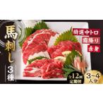 【ふるさと納税】【12回定期便】馬刺し バラエティセット 3種類 〜3・4人前〜 +タレ小 馬刺し 食べ比べ セット 特選霜降り馬刺し 霜降り馬刺し 馬刺し 馬肉 桜肉 馬 肉 霜降り 中トロ 赤身 タレ付き 冷凍 刺身 九州 熊本県 特産品 山鹿 送料無料【馬刺しの郷 民守】[ZBL104]