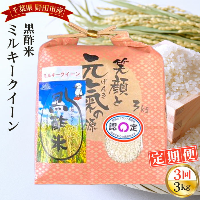 【ふるさと納税】No.059 【毎月定期便3回】野田産黒酢米ミルキークイーン 3kg / 令和7年 新米 米 お米 こめ コメ 精米 白米 ご飯 国産米 3kg 3キロ 黒酢米 ミルキークイーン もちもち モチモチ ツヤ おいしい お取り寄せ 産地直送 産直 定期 毎月お届け 送料無料 千葉県