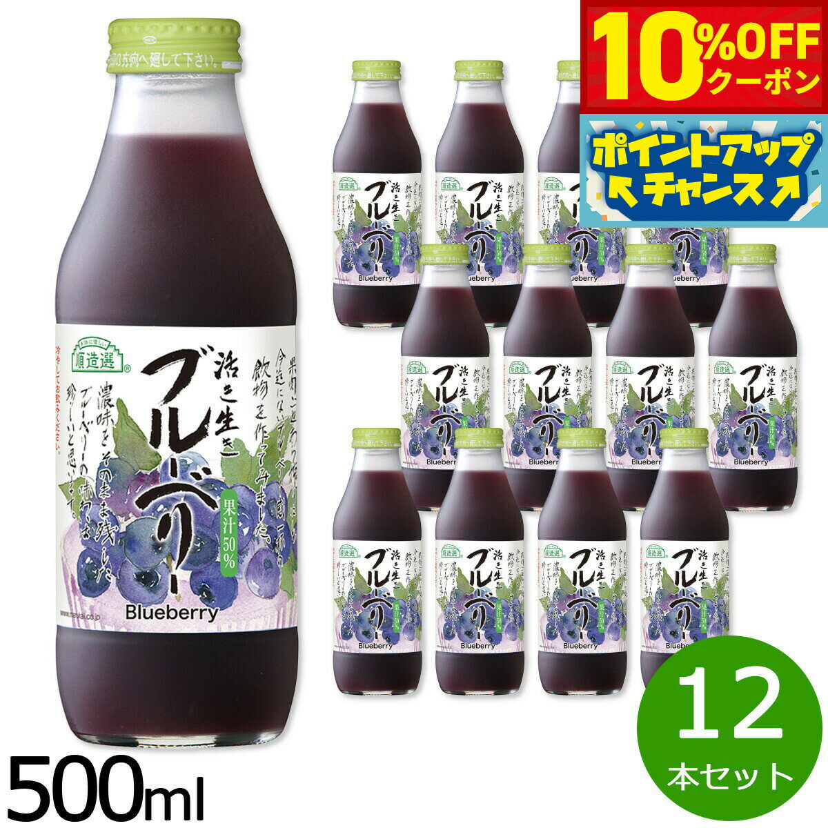 【10%OFFクーポン!&店内ポイント最大46倍!12月1日!】順造選 ブルーベリー 500ml×12本セット ジュース ストレート 果汁50 無添加 無香料 瓶 日本製 粗搾り 果肉入り 【送料無料】