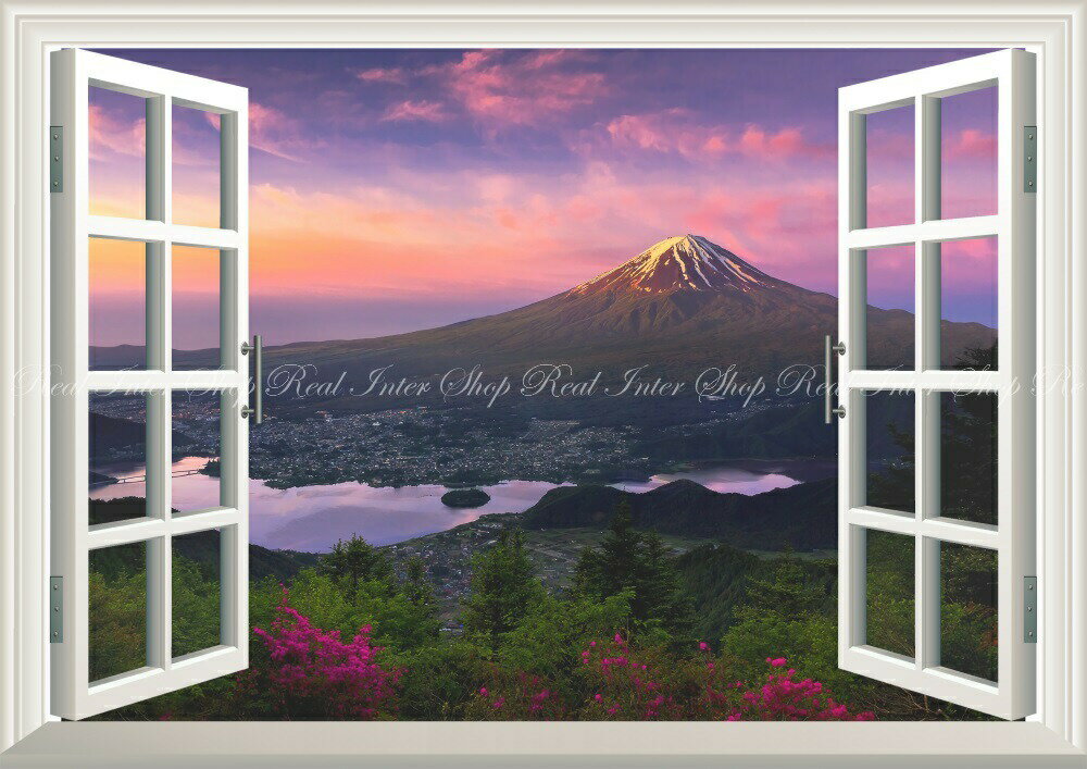 絵画風 壁紙ポスター (はがせるシール式) -窓の景色- 桃富士 富士山 赤富士 夕焼け 開運 パワースポット【窓仕様/トリックアート】 キャラクロ FJS-007MA1 (A1版 830mm×585mm) <日本製> ウォールステッカー お風呂ポスター