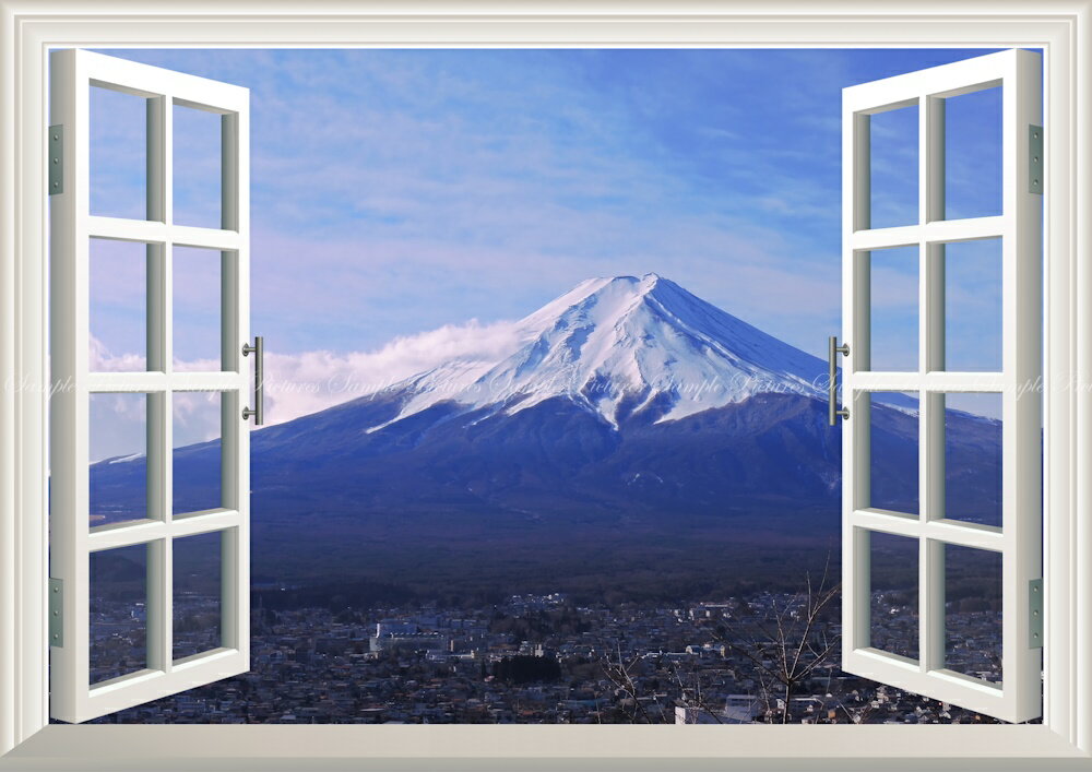 絵画風 壁紙ポスター (はがせるシール式) -窓の景色- 冬晴れの富士山と流れ雲 表富士 富士山 ふじやま 【窓仕様/トリックアート】 キャラクロ FJS-048MA1 (A1版 830mm×585mm) <日本製> ウォールステッカー お風呂ポスター