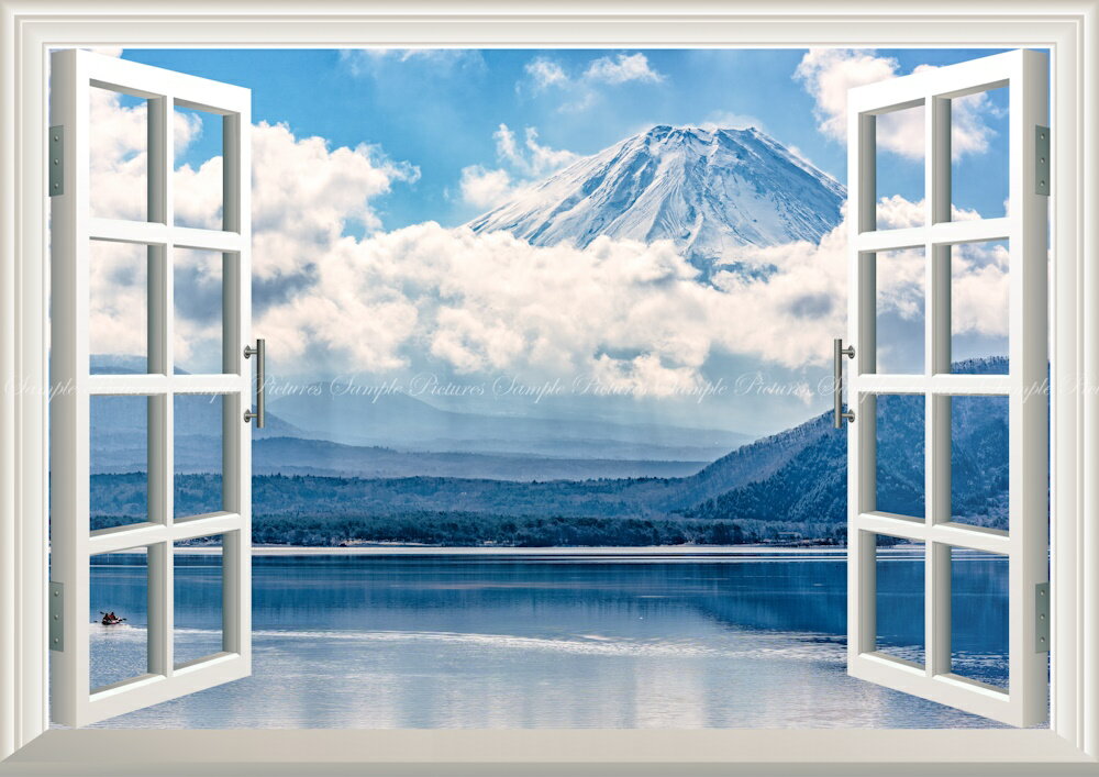 絵画風 壁紙ポスター (はがせるシール式) -窓の景色- 冠雪の富士山と山中湖 白富士 裏富士 富士山 開運 パワースポット【扉なし窓仕様】 キャラクロ FJS-050NA1 (A1版 830mm×585mm) <日本製> ウォールステッカー お風呂ポスター