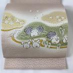 袋帯 逸品 うさぎ 鳥 金彩 ぼかし 薄小豆 お太鼓柄 正絹 中古