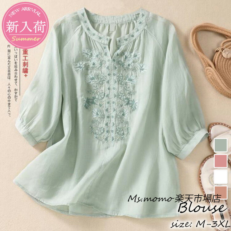 ブラウス レディース 七分袖ブラウス 夏 オフィスブラウス 花刺繍 Vネック オシャレTシャツ 綿麻トップス 韓国風 大人 通勤OL ゆったりシャツ 40代 30代 50代