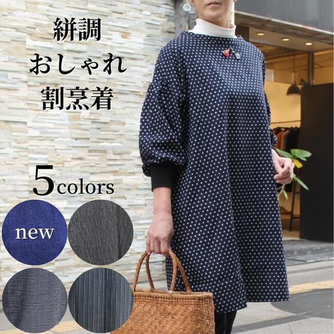 新柄追加!【絣調おしゃれ割烹着】割烹着 かっぽう着 日本製 エプロン 長袖 チュニック ワンピース リブ袖 レディース ミセス シニア ファッション 40代 50代 60代 70代 おしゃれ ゆったり あったか 大きいサイズ 秋冬春 和風 和柄 スモック 大人 メール便送料無料