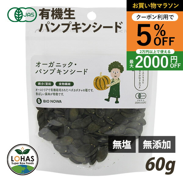 \お買い物マラソン限定24日20時〜5%offクーポン/ オーガニック パンプキンシード (生・かぼちゃの種) 60g 有機JAS認証 無塩 無添加 添加物不使用 ローフード 酵素 BIONOWA ビオノワ ロハス LOHAS