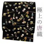 袋帯 山下織物 正絹 黒地 優彩好日紋 唐織 仕立て上がり 礼装用 セミフォーマル 花 こけし かんざし 御所車 手毬No.6-2147