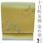 名古屋帯 未使用 正絹 縮緬 染め帯 九寸 金彩加工 くすみカラー 芥子色 水色 薄緑 桜 カジュアル 新古品 仕立て上がり みやがわ sb55088