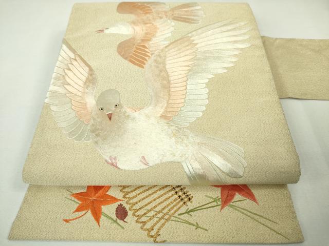 平和屋本店■極上 アンティーク 大正ロマン 綴れ 八寸名古屋帯 総手刺繍 鳩 熊手 金通し地 逸品 DZAA4745kh5