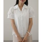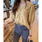 ブラウス シャツ ソリッドカラー くるみボタン 開襟 パフスリーブ ブラウス レディース