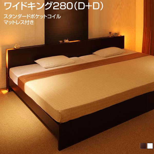 組立設置付 日本製 収納 ベッド マットレス付 ワイドキング280 (ダブル×2台) ローベッド 連結ベッド 高さ調整 国産 大型ベッド 広いベッド 宮付き コンセント 照明 ライト すのこベッド 家族 夫婦 親子ベッド ファミリーベッド スタンダードポケットコイルマットレス付き