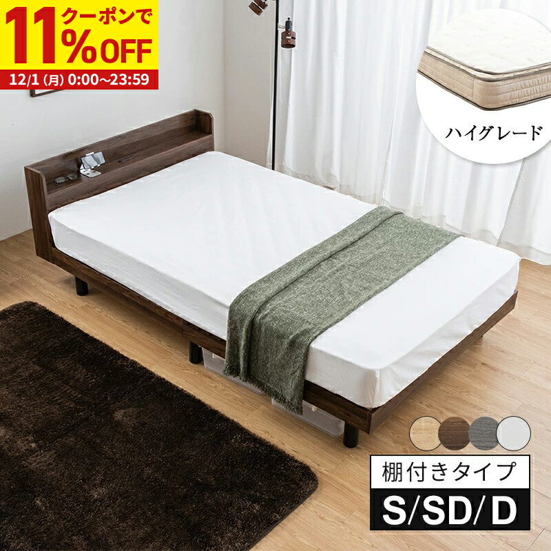 【11%OFFクーポン配布中★12/1に使える】 ベッド マットレスセット すのこベッド シングル セミダブル ダブル マットレスセット ベッドフレーム 棚付き コンセント シンプル ユーロトップ ホワイト ブラウン グレー ナチュラル ベット おしゃれ