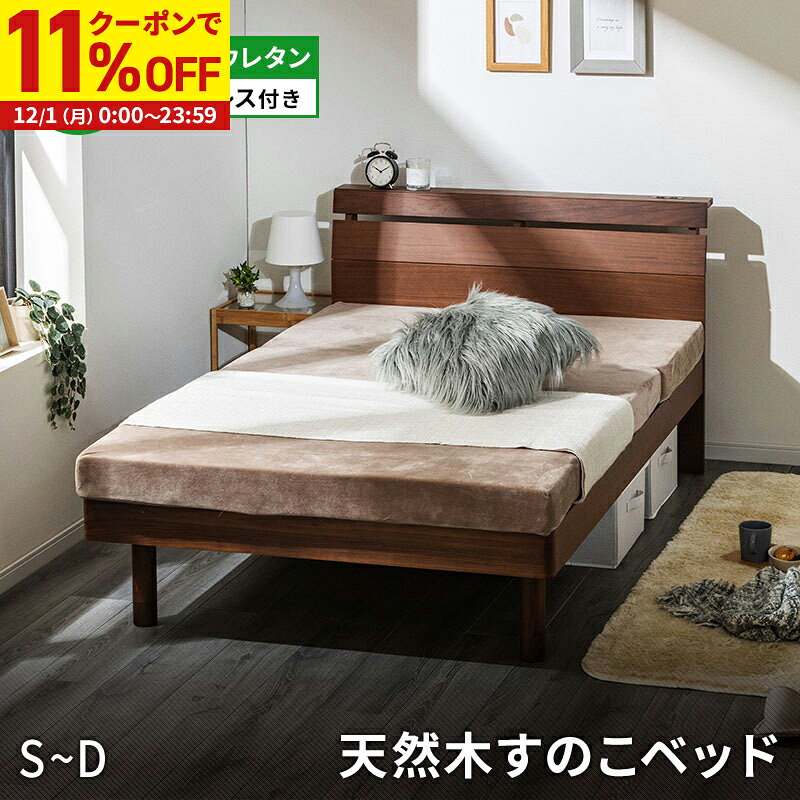 【11%OFFクーポン配布中★12/1に使える】 ベッド 高級感 ウレタンマットレスセット コンセント付き シングル セミダブル ダブル ウォルナット ヘッドボード 無垢材 天然木 桐材 頑丈すのこベッド 収納 脚 高さ調節 北欧風 木製ベッド 棚付きベッド おしゃれ