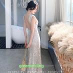 カラードレス パーティードレス ロングドレス スレンダーライン バックレス 二次会 演奏会 発表会 披露宴 イブニングドレス キャバドレス シルバー スパンコール
