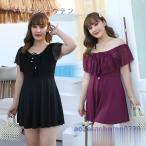 ワンピース水着 体型カバー 大きいサイズ レディース ママ オフショルダー オールインワン フレア な肩だしにふんわりスリーブで二の腕を可愛くカバー
