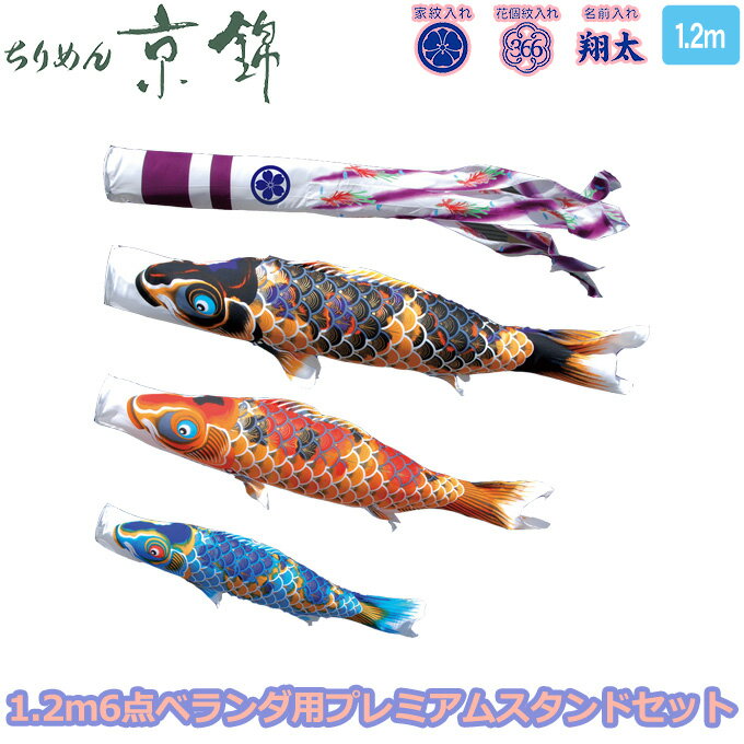 鯉のぼり ベランダ用 ちりめん京錦 2m 6点 プレミアムベランダスタンドセット 吹流し+鯉3匹+矢車+ロープ+ポール+スタンドセット徳永鯉のぼり カタログ 純正品 ポリエステル 撥水加工 家紋/花個紋/名前入れ対応 日本製 KOT-BS-116-730