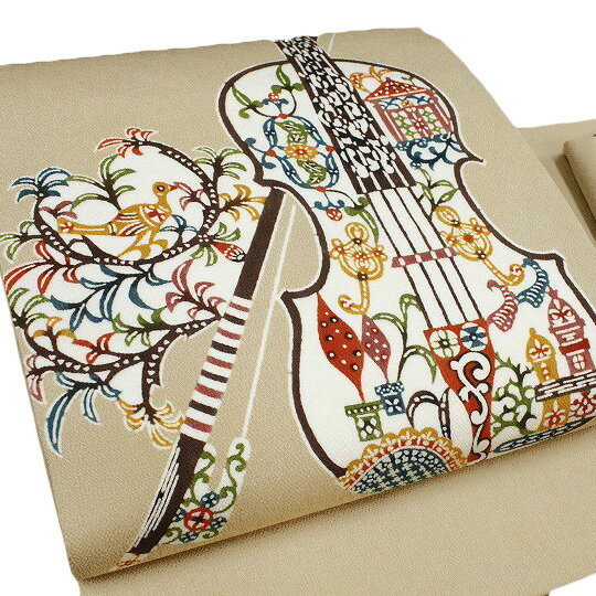 名古屋帯 九寸帯 栗山吉三郎工房 和染紅型 バイオリン 正絹 浜ちりめん 仕立て上がり カジュアル 染帯 ベージュ d545