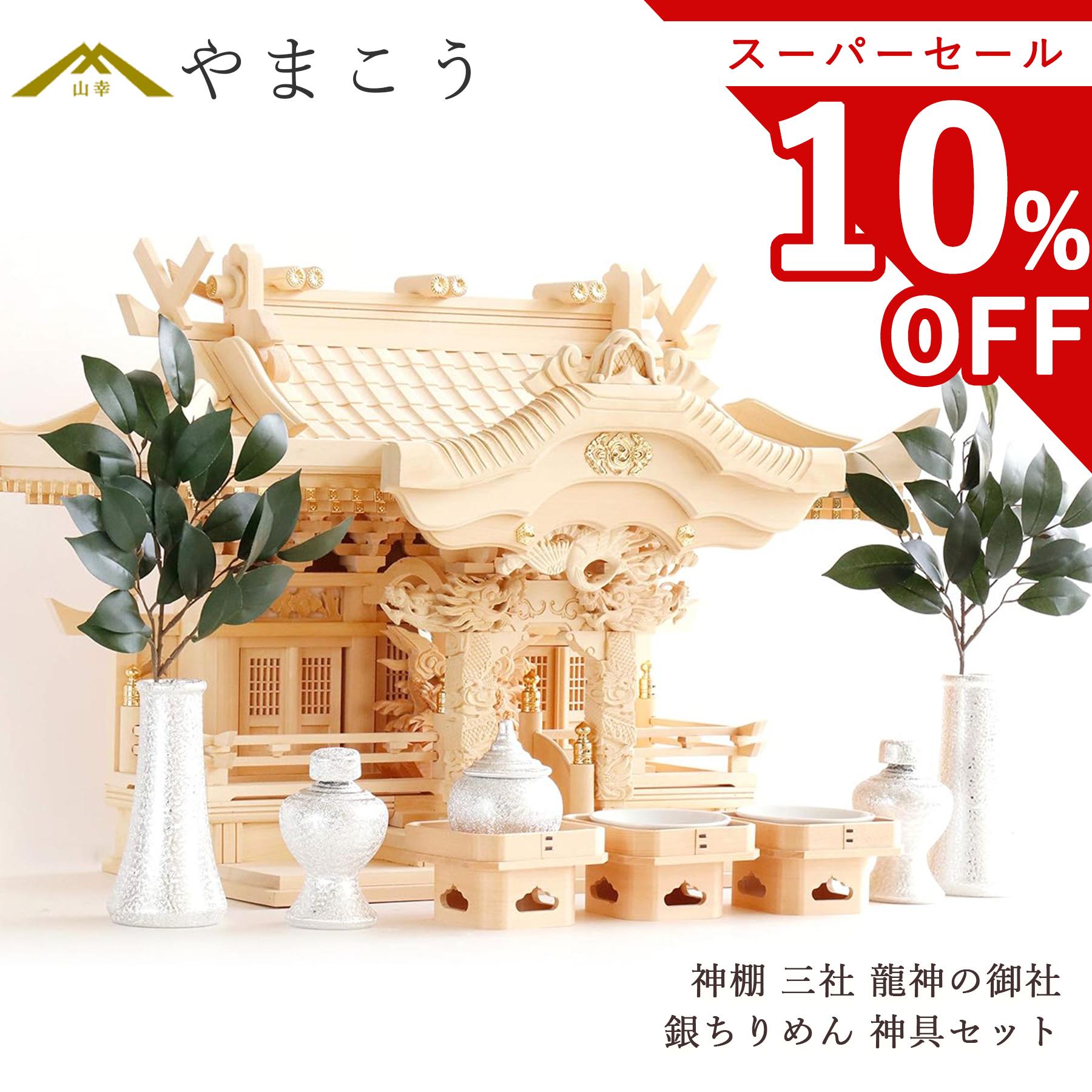 【スーパーセール限定 10%OFF】 龍神の御社 ■■ 鶴は舞い、龍踊る ■■ 三社 入母屋 神棚セット ■ 銀ちりめん 神具 ■ 美しく、壮大に祀る ■ 彫刻と真鍮金具の モダン神棚 ■ 限定数のみ 神棚 神具 仏具 盆提灯 やまこう 山幸