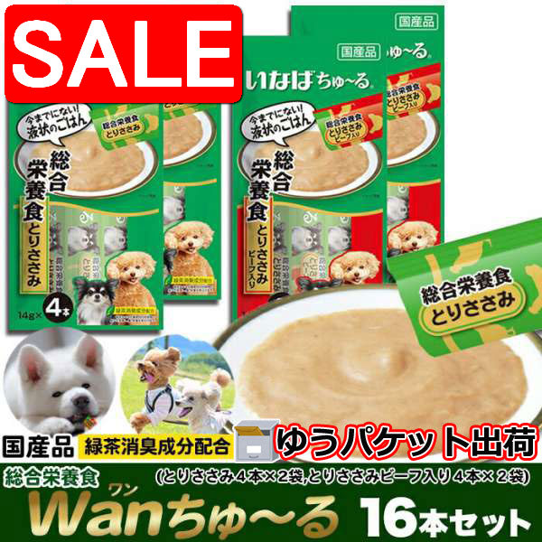 【スーパーSALE 10%OFF!】 【ゆうパケット出荷】 Wanちゅ〜る 総合栄養食 2種類 16本セット とりささみ4本x2袋 1本14g とりささみ ビーフ入り4本x2袋 1本14g 犬用 おやつ ごはん ちゅーる フード 緑茶消臭成分配合 鶏肉 国産品