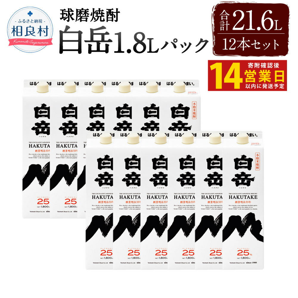【ふるさと納税】【14営業日以内発送予定】 白岳 1,800ml パック 12本 25度 1.8L 合計21.6L 焼酎 米焼酎 米 お酒 酒 さけ アルコール 球磨焼酎 国産米 米麹 まろやか マイルド 喉ごし 口あたり お湯割り 水割り ロック 家飲み 紙パック 高橋酒造 熊本県 相良村 送料無料