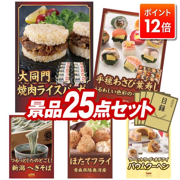 ★ポイント12倍★12/4 20:00 〜要エントリー!忘年会景品 25点セット 特大パネル 豪華目録 ビンゴ 結婚式 披露宴 二次会 忘年会 新年会 ゴルフコンペ 景品セット 【大同門焼肉ライスバーガー、うるわし手鞠わさび葉寿司】 送料無料 特大パネル 豪華目録付き