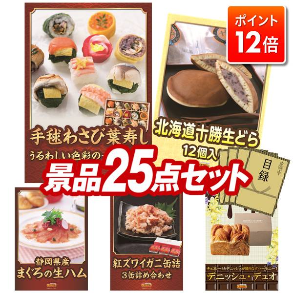 ★ポイント12倍★12/4 20:00 〜要エントリー!忘年会景品 25点セット 特大パネル 豪華目録 ビンゴ 結婚式 披露宴 二次会 忘年会 新年会 ゴルフコンペ 景品セット 【うるわし手鞠わさび葉寿司、入蔵 北海道十勝生どら12個】 送料無料 特大パネル 豪華目録付き