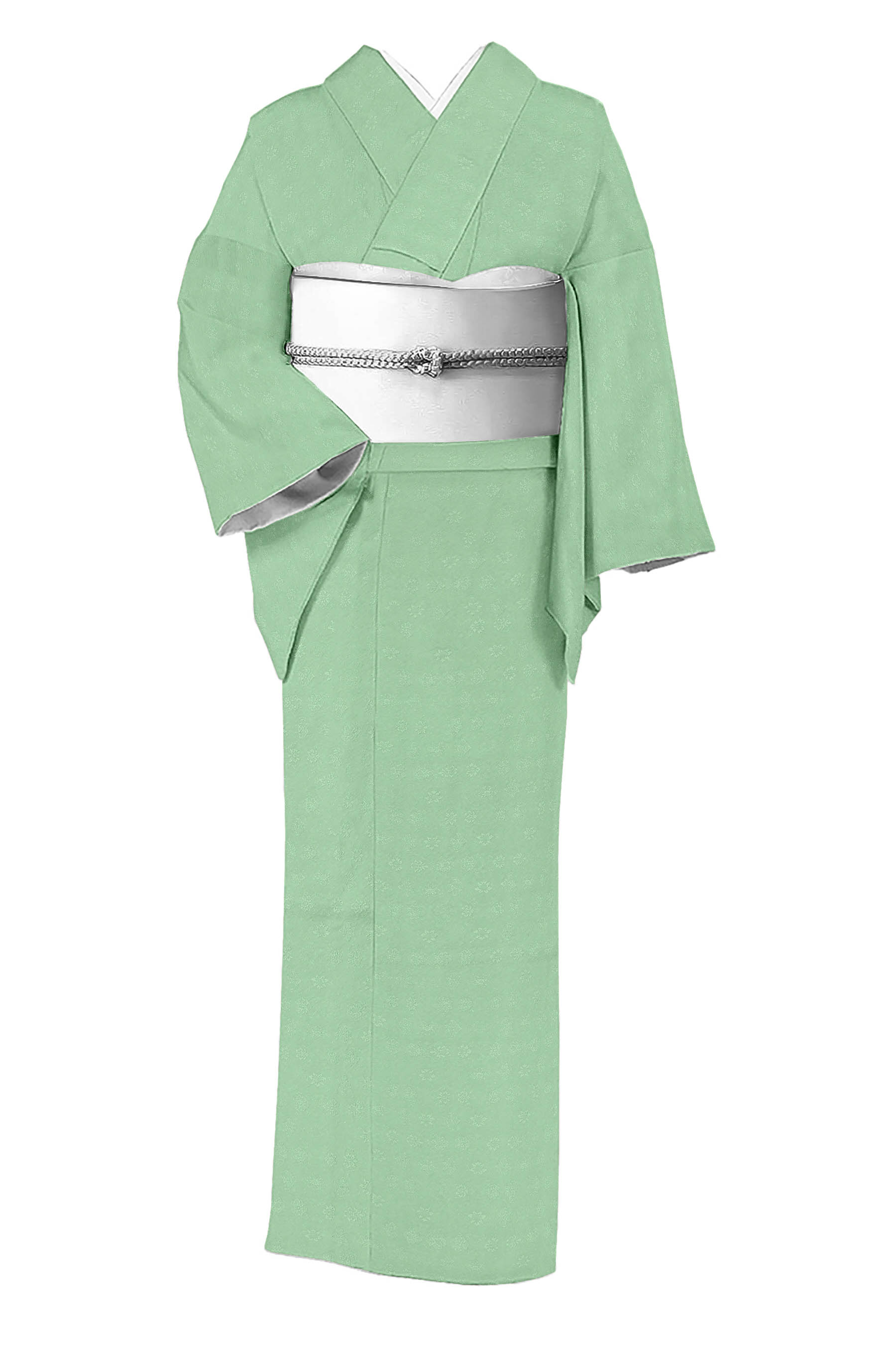 【15%OFFクーポン対象】 【京の染匠】 特選紋意匠色無地 ≪御仕立て上がり・中古美品≫ 「山葵色」 帯合わせで様々に 重宝の色無地 身丈166.5 裄69.5