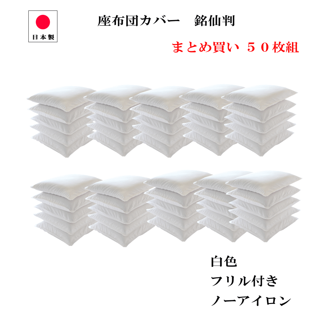 【★全品P5倍+5%OFFクーポン有★】 座布団カバー 55×59 銘仙判 50枚組み 日本製 白色 フリル付 55cm×59cm 高密度 186本 打ち込み ざぶとんカバー