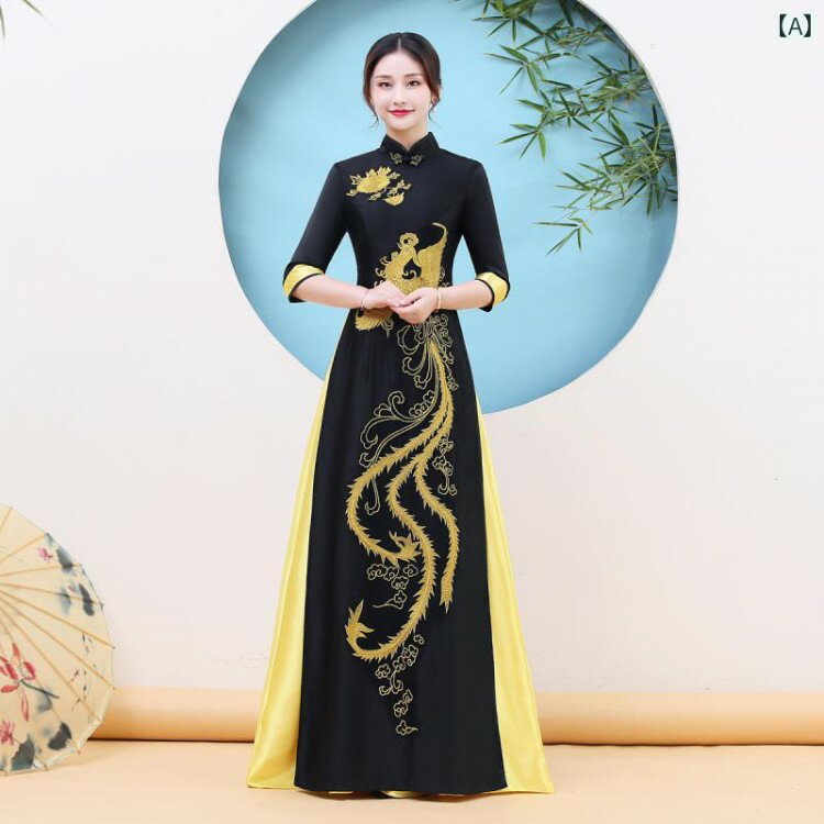 【クーポン利用で10%OFF】アオザイ チャイナドレス レディース エレガント パフォーマンス ブラック 衣装 刺繍 ストレート 7分袖 コーラス ベトナム