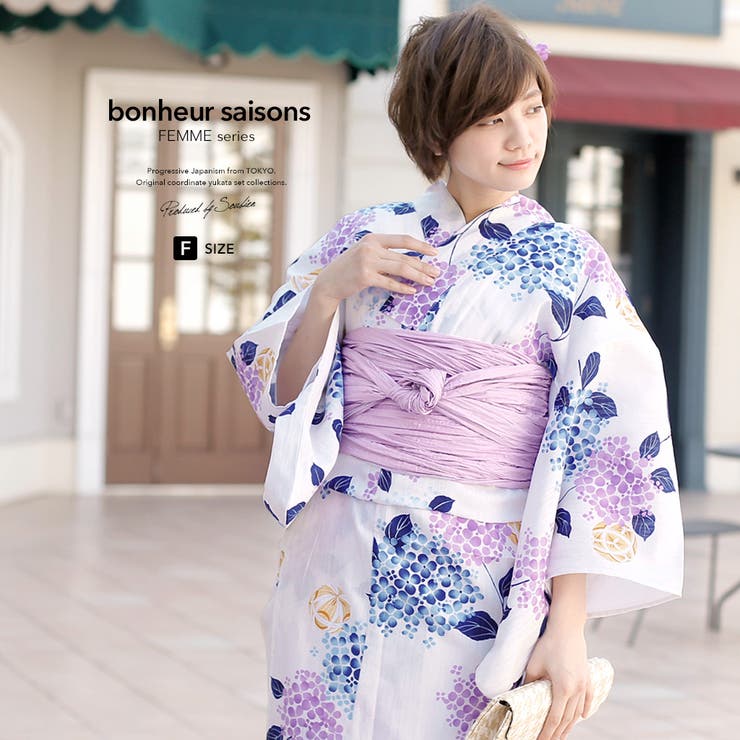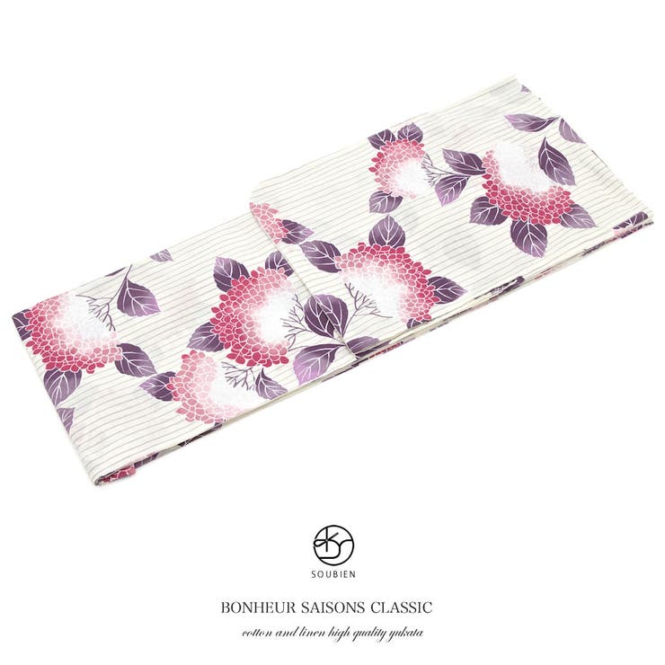 【10%OFFクーポン!12/11(木)1:59まで】SOUBIEN レディース浴衣 bonheursaisons ボヌールセゾン 白 オフホワイト レッドパープル 紫陽花 縞 ストライプ 花 綿麻 夏祭り 花火大会 女性用 仕立て上がり フリーサイズ